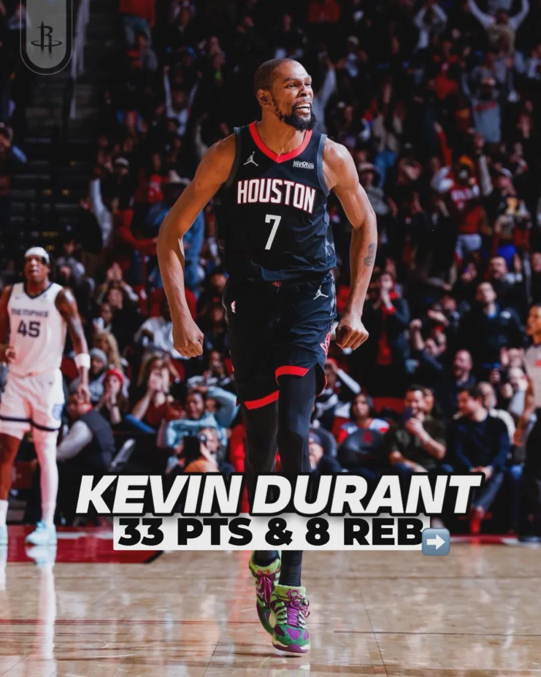 火箭老将凯文-杜兰特发挥出色:首发出战37分钟,投篮24中11,三分9中4,罚球9中7,砍下33分8篮板2助攻1盖帽2失误。杜兰特已经连续三场比赛砍下30+:36分、32分和33分,成为NBA历史第五个在37岁后做到这点的球员。